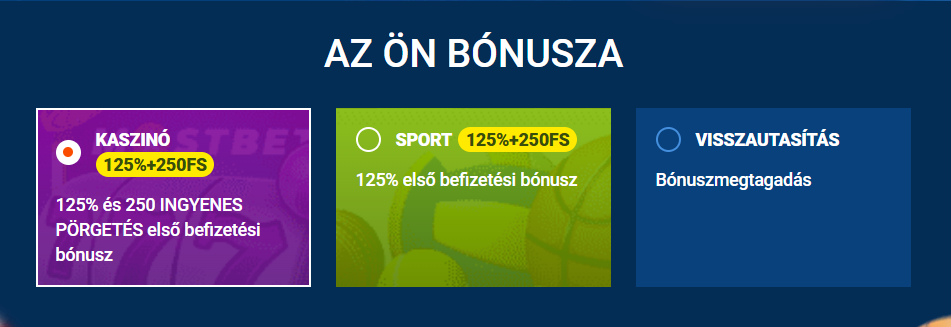 A kaszinó üdvözlő bónusz a nyerőgépek és asztali játékok kedvelőinek kínál vonzó lehetőséget. Az új felhasználók az első befizetésükkor 125%-os bónuszt és 250 ingyenes pörgetést kapnak, amelyek leggyakrabban a Starburst vagy Book of Sun játékokban használhatók fel. A minimális befizetés szintén 5 000 HUF, míg a maximális bónuszösszeg 160 000 HUF.
